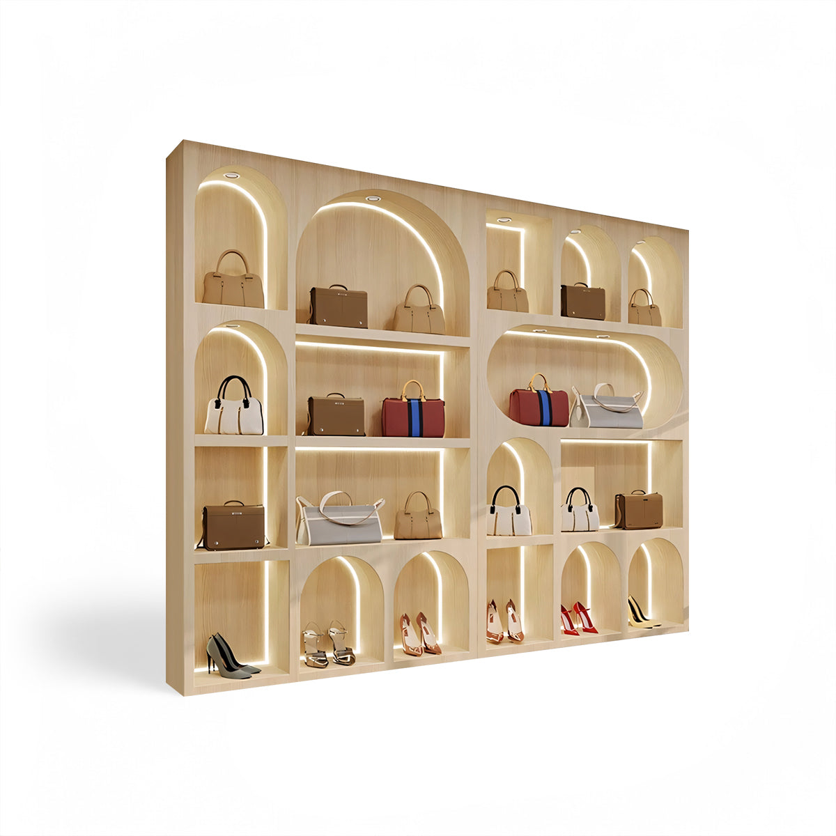 | Trendy custom arc display cabinets, tailor-made for boutique clothing stores! Ingenious design, in line with spatial aesthetics, perfectly frames your fashion pieces like artworks. It's an eye-catching display essential that combines practicality and style, helping your store lead the fashion trend and boost sales. | |