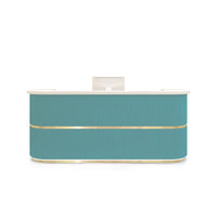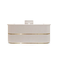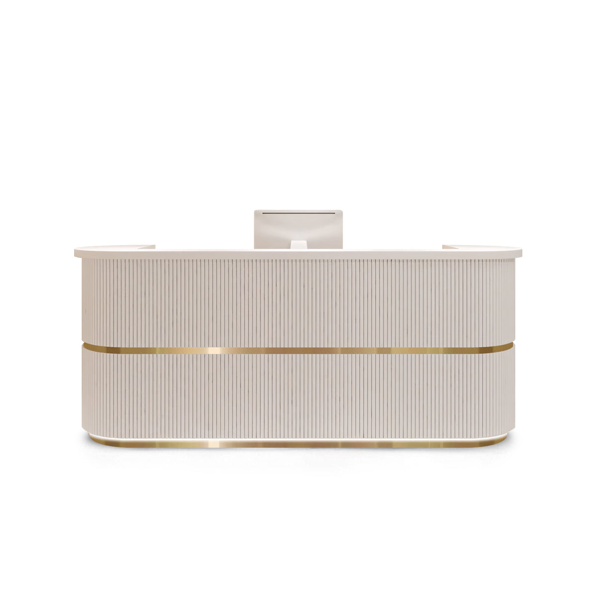 | This is a highly charming front desk reception counter. It comes fully assembled, saving you the hassle of complex installation. Its curved shape is smooth and elegant, like a fine piece of art. The golden decorative lines on it are like a brilliant starry sky, adding a luxurious atmosphere to the entire reception counter. And with built - in LED lights, it illuminates the area with a warm, inviting glow, creating an even more appealing ambience. The vertical - stripe design is unique, revealing a delicate texture in simplicity.? | |