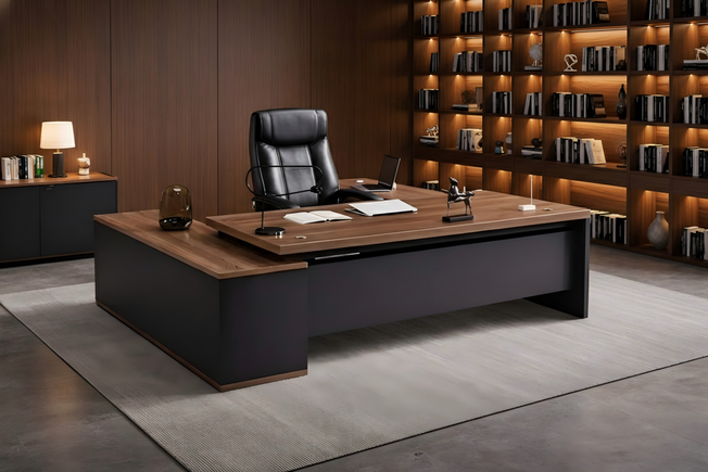 Modern and Minimalist Executive Desk for Managers LBZ-724 This Italian-inspired L-shaped executive desk features deep walnut finishes and E1-grade panels crafted for reliable performance. It includes a large side cabinet and thickened desktop with refined edge-banding for stability...