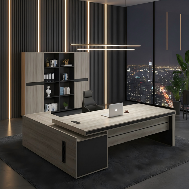 Light Luxury Boss Office Computer Desk LBZ-1021 Description: Upgrade your workspace with our stylish deluxe executive desk with cabinet table, a fusion of sophistication and functionality. This desk exudes a contemporary charm, featuring a sleek design and...