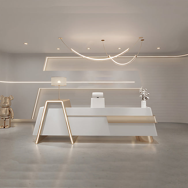 Simple Modern Hotel Company Front Desk Reception Desk JDT-7175 This reception desk exudes a modern and minimalist style. It features an all - in - one design with smooth and natural lines. LED light strips are installed under the...
