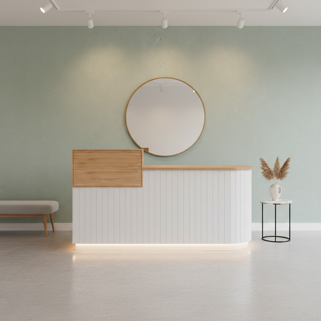 | The reception desk features a sleek side curve design, ideal for front desk operations such as cashiering, office work, and guest reception. Its spacious countertop provides ample working space, while the interior drawers and storage cabinets offer convenient organization. Crafted from E1-grade high-density board, this desk boasts a modern minimalist style, making it a perfect addition to contemporary office environments, hotels, or retail stores. | |