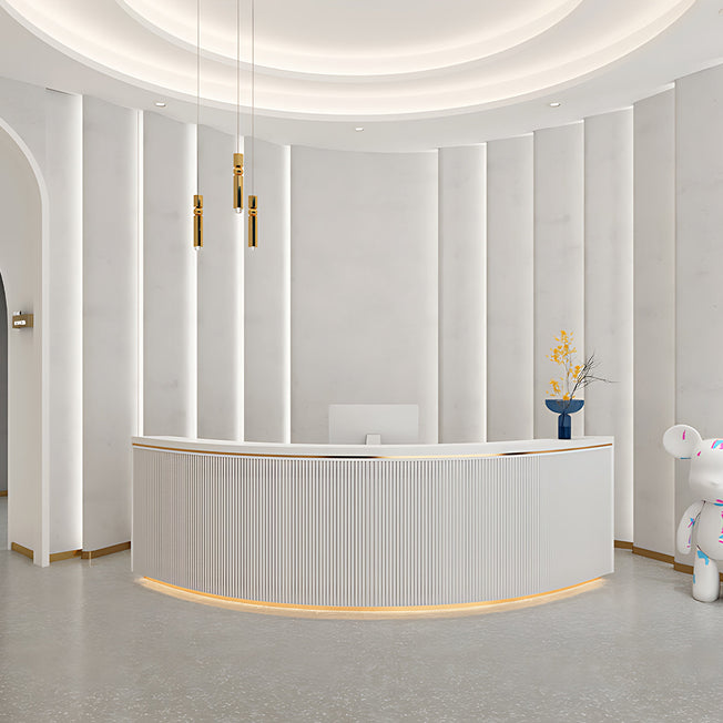 Simple Modern Round Bar Cashier Table JDT-K072 Everyone, focus your eyes here! This reception desk features flexible curved lines that outline a unique and elegant silhouette. The simple and stylish countertop design perfectly blends simplicity and practicality....