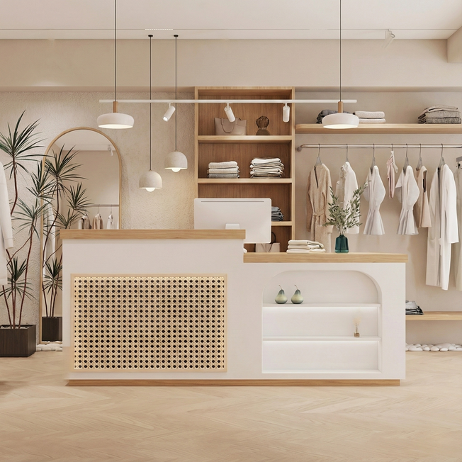Modern Rattan Woven Reception Desk JDT-2161 Elevate your store's style with this Japanese wabi - sabi reception desk. Its soft, soothing hues exude a natural, rustic charm, crafting a serene and cozy ambiance that resonates with...