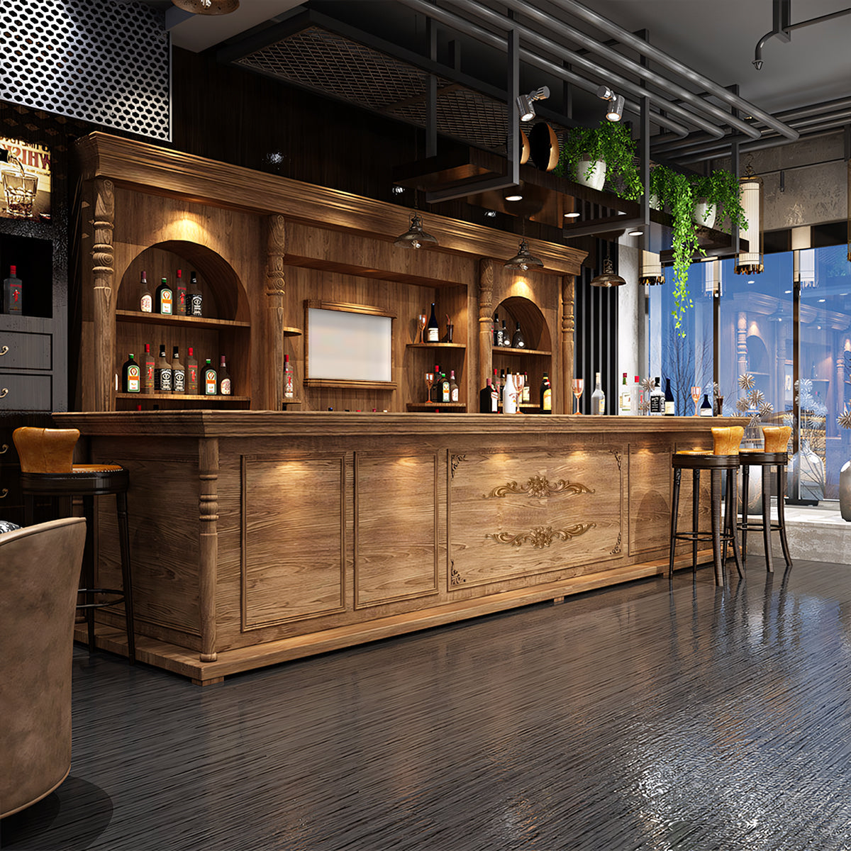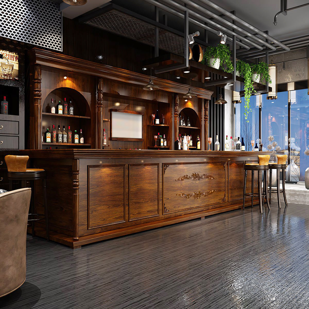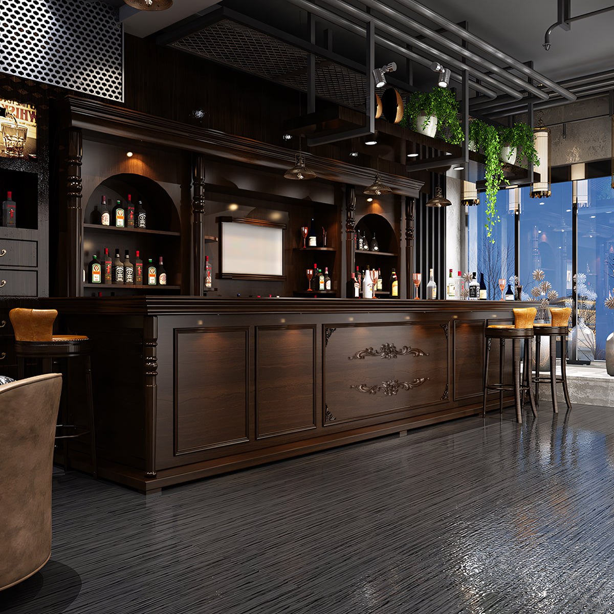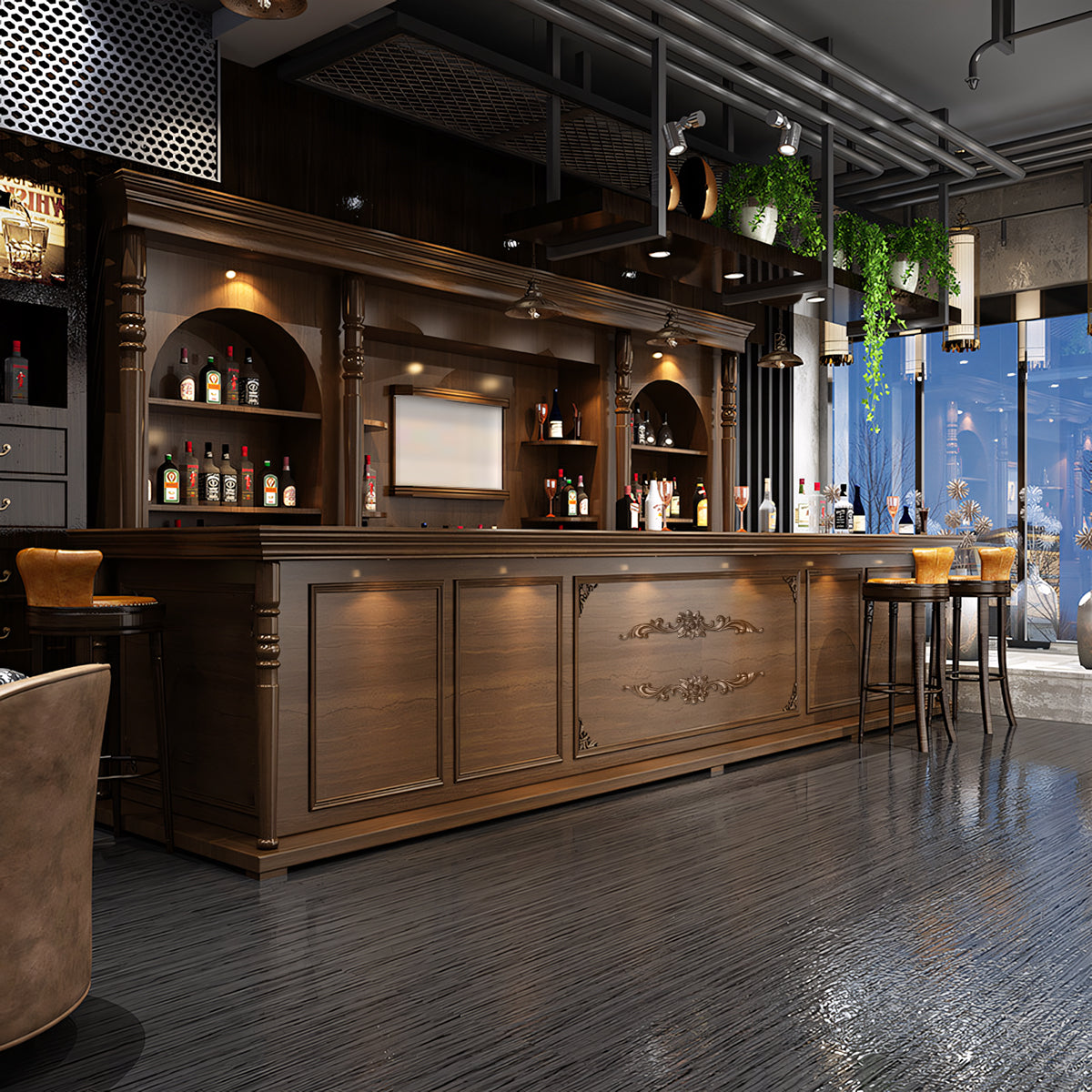 | The European-style retro corner curved bar counter is like a work of art, adding charm and elegance to your commercial space. Its ingenious design with smooth curved lines makes good use of space and creates a warm and comfortable atmosphere. It's widely applicable to bars, coffee shops, restaurants, etc. With a perfect combination of exquisite appearance and practical functions, its delicate carvings and retro colors show European romance and luxury. Choose it to bring more attraction and success to your business. | |