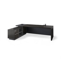 This Italian-inspired L-shaped executive desk features deep walnut finishes and E1-grade panels crafted for reliable performance. It includes a large side cabinet and thickened desktop with refined edge-banding for stability and durability. The desk pairs beautifully with a premium leather high-back chair, making it ideal for executives or creative professionals.