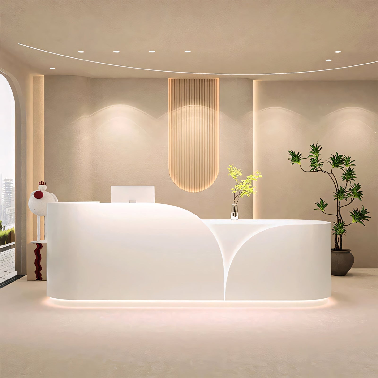 | This modern minimalist reception desk features a sleek and contemporary design, enhanced by LED lighting for a touch of sophistication. Suitable for various commercial spaces and office environments, it offers efficient reception services with a stylish flair. |