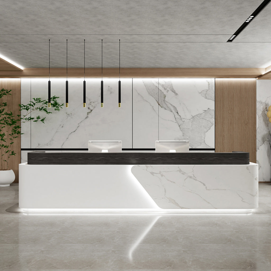 This reception desk is creative and minimalist. The overall shape is elegant, and the design lines are smooth. There is the wooden decorative strip above the desktop, which adds a warm and special feeling.